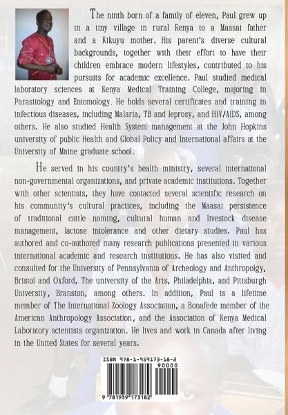 The ninth born of a family of eleven, Paul grew up in a tiny village in rural Kenya to a Maasai father and a Kikuyu mother. His parents' diverse cultural backgrounds, together with their effort to have their children embrace modern lifestyles, contributed to his pursuits for academic excellence. Paul studied medical laboratory sciences at Kenya medical training college, majoring in parasitology/entomology. He holds several certificates and training in infectious diseases, including Malaria, TB and leprosy, and HIV/AIDS, among others. He also studied Health System management at the John Hopkins university of public health and Global policy and international affairs at the University of Maine graduate school. He served in his country's health ministry, several international non-governmental organizations, and private academic institutions. Together with other scientists, they have contacted several scientific research on his community's cultural practices, including the Maasai persistence of traditional cattle naming, cultural human and livestock disease management, lactose intolerance tests and other dietary studies. Paul has authored and co-authored many research publications in various international academic and research institutions. He has also acted as a visiting consulting scholar at the University of Pennsylvania museum of archaeology and anthropology, Bristol and Oxford, the University of the arts, Philadelphia, and Pittsburgh university Branston, among others. In addition, Paul is a lifetime member of the international zoology association, a Bonafede member of the American anthropology association, and the association of Kenya laboratory scientists' organization. He lives and works in Montreal, Canada, after living in the United States for several years.
