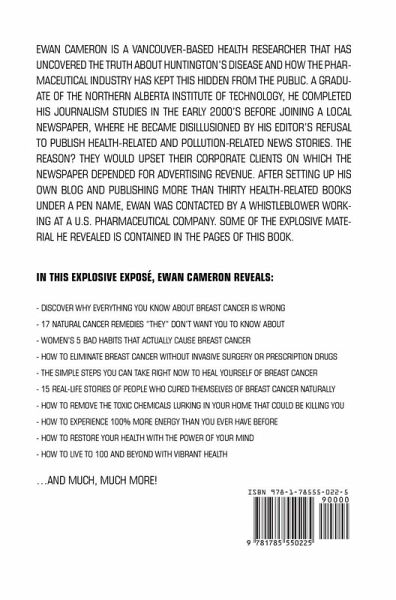 Ewan Cameron is a Vancouver-based health researcher that has uncovered the truth about Huntington’s disease and how the pharmaceutical industry has kept this hidden from the public. a graduate of the northern Alberta institute of technology, he completed his journalism studies in the early 2000’s before joining a local newspaper, where he became disillusioned by his editor’s refusal to publish health-related and pollution-related news stories. the reason? they would upset their corporate clients on which the newspaper depended for advertising revenue. after setting up his own blog and publishing more than thirty health-related books under a pen name, Ewan was contacted by a whistleblower working at a U.S. pharmaceutical company. some of the explosive material he revealed is contained in the pages of this book. In this explosive exposé, Ewan Cameron reveals: - Discover why everything you know about breast cancer is wrong - 17 natural cancer remedies "they" don’t want you to know about - Women’s 5 bad habits that actually cause breast cancer - How to eliminate breast cancer without invasive surgery or prescription drugs - The simple steps you can take right now to heal yourself of breast cancer - 15 real-life stories of people who cured themselves of breast cancer naturally - How to remove the toxic chemicals lurking in your home that could be killing you - How to experience 100% more energy than you ever have before - How to restore your health with the power of your mind - How to live to 100 and beyond with vibrant health …and much, much more!
