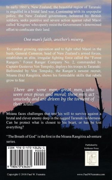In early 1860’s, New Zealand, the beautiful region of Taranaki is engulfed in a brutal land war. Continuing with its unpopular policy, the New Zealand government, bolstered by British soldiers, seeks punitive and severe action against rebel Maori called ‘Kingites’ who openly resist the Government’s determined effort to confiscate their land. To combat growing opposition and to fight rebel Maori in the bush, General Cameron, head of New Zealand’s armed forces, establishes an elite, irregular fighting force called the "Forest Rangers." Forest Ranger Company No. 2, commanded by Captain Gustavus Von Tempsky, deploys his troops to Taranaki. Befriended by Von Tempsky, the Ranger’s newest recruit, Moana (Ira) Rangitira, shows his formidable skills that rebels grow to fear. Moana faces challenges that test his will to survive against a brutal and clever enemy deep in the rugged Taranaki wilderness. Can he protect what is closest to his heart, or has he lost everything? "The Breath of God" is the first in the Moana Rangitira adventure series.