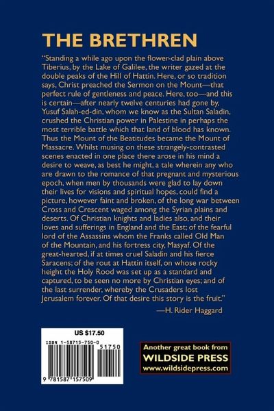 "Standing a while ago upon the flower-clad plain above Tiberius, by the Lake of Galilee, the writer gazed at the double peaks of the Hill of Hattin. Here, or so tradition says, Christ preached the Sermon on the Mount--that perfect rule of gentleness and peace. Here, too--and this is certain--after nearly twelve centuries had gone by, Yusuf Salah-ed-din, whom we know as the Sultan Saladin, crushed the Christian power in Palestine in perhaps the most terrible battle which that land of blood has known. Thus the Mount of the Beatitudes became the Mount of Massacre. Whilst musing on these strangely-contrasted scenes enacted in one place there arose in his mind a desire to weave, as best he might, a tale wherein any who are drawn to the romance of that pregnant and mysterious epoch, when men by thousands were glad to lay down their lives for visions and spiritual hopes, could find a picture, however faint and broken, of the long war between Cross and Crescent waged among the Syrian plains and deserts. Of Christian knights and ladies also, and their loves and sufferings in England and the East; of the fearful lord of the Assassins whom the Franks called Old Man of the Mountain, and his fortress city, Masyaf. Of the great-hearted, if at times cruel Saladin and his fierce Saracens; of the rout at Hattin itself, on whose rocky height the Holy Rood was set up as a standard and captured, to be seen no more by Christian eyes; and of the Iast surrender, whereby the Crusaders lost Jerusalem forever. Of that desire this story is the fruit." -- H. Rider Haggard