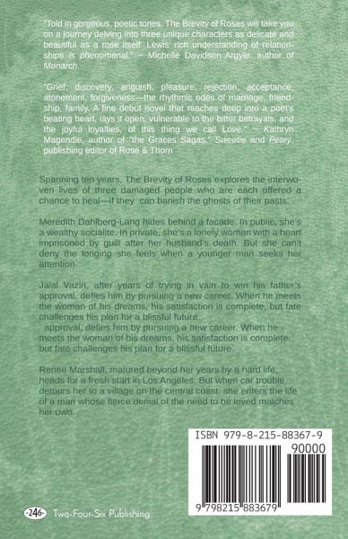 Spanning ten years, The Brevity of Roses explores the interwoven lives of three damaged people who are each offered a chance to heal--if they can banish the ghosts of their pasts. Meredith Dahlberg-Lang hides behind a façade. In public, she's a wealthy socialite. In private, she's a lonely woman with a heart imprisoned by guilt after her husband's death. But she can't deny the longing she feels when a younger man seeks her attention. Jalal Vaziri, after years of trying in vain to win his father's approval, defies him by pursuing a new career. When he meets the woman of his dreams, his satisfaction is complete, but fate challenges his plan for a blissful future. Renee Marshall, matured beyond her years by a hard life, heads for a fresh start in Los Angeles. But when car trouble detours her to a village on the central coast, she enters the life of a man whose fierce denial of the need to be loved matches her own.