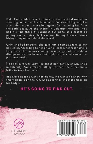 Duke Evans didn't expect to interrupt a beautiful woman in a staring contest with a bison on his favorite hiking trail. He also didn't expect to see her again after rescuing her from the surly beast. As the sheriff in Calamity, Montana, he's had his fair share of surprises but none as pleasant as pulling over a shiny black car and finding his mysterious hiking companion behind the wheel. Only, she lied to Duke. She gave him a name as fake as her hair color. According to her driver's license, her real name is Lucy Ross, the famous country music singer whose sudden disappearance has been a hot topic in the media over the past two weeks. He's not sure why Lucy lied about her identity or why she's in Calamity. And she's not talking. Instead, she offers him a bribe to keep her secret. But Duke doesn't want her money. He wants to know why this woman is on the run. And as long as the star shines on his badge, he's going to find out.