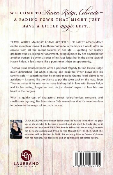 Welcome to Haven Ridge, Colorado-a fading town that might just have a little magic left... Travel writer Mallory Adams accepted her latest assignment on the mountain towns of southern Colorado in the hopes it would offer an escape from all the recent failures in her life-quitting her history graduate studies, losing her apartment, being dumped by her boyfriend for another woman. So when a series of mishaps lands her in the dying town of Haven Ridge, it feels more like a punishment than an opportunity. Thomas Rivas returned home after a personal tragedy to find Haven Ridge much diminished. But when a plucky and beautiful writer blows into his family's cafe-something that his mystic-minded Granny Pearl claims is no accident-it seems like the chance to put the town back on the map. Soon Thomas makes it his mission to make Mallory fall in love with Haven Ridge and its fascinating, forgotten past-he just doesn't expect to lose his own heart in the bargain. With its quirky cast of characters, sweet love-after-loss romance, and small-town mystery, The Brick House Cafe reminds us that it's never too late to believe in the magic of second chances.