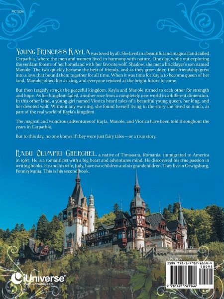 Young Princess Kayla was loved by all. She lived in a beautiful and magical land called Carpathia, where the men and women lived in harmony with nature. One day, while out exploring the verdant forests of her homeland with her favorite wolf, Shadow, she met a bricklayer's son named Manole. The two quickly became the best of friends, and as they grew older, their friendship grew into a love that bound them together for all time. When it was time for Kayla to become queen of her land, Manole joined her as king, and everyone rejoiced at the bright future to come. But then tragedy struck the peaceful kingdom. Kayla and Manole turned to each other for strength and hope. As her kingdom faded, another rose from a completely new world in a different dimension. In this other land, a young girl named Viorica heard tales of a beautiful young queen, her king, and her devoted wolf. Without any warning, she found herself living in the story she loved so much, as part of the real world of Kayla's kingdom. The magical and wondrous adventures of Kayla, Manole, and Viorica have been told throughout the years in Carpathia. But to this day, no one knows if they were just fairy tales-or a true story.