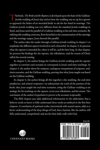 This book, The Bride and the Rapture, is developed upon the basis of the Galilean-Jewish wedding of Jesus's day and on how the wedding was set up for a groom to approach the father of an intended bride to ask for her hand in marriage. The Galilean-Jewish wedding was very different from the standard Jewish weddings in Israel, and Jesus used the parallel of a Galilean wedding to his end-time scenarios. By utilizing this wedding ceremony, from betrothal to the consummation of the marriage and the marriage supper, Jesus showed this parallel. The author takes the reader through a Galilean-Jewish wedding in chapter 1 to emphasize the different aspects involved in such a betrothal. In chapter 2, he presents what the rapture is intended for, when it will be, and for how long. In that chapter, he presents his findings for the rapture, the tribulation, and the return of Christ called the second coming. In chapter 3, the author brings the Galilean-Jewish wedding and the rapture together to correlate each scenario to correspond to Jesus's end-time teachings. In chapter 3, the author shows by scripture, analogous comparisons of scripture, end-times scenarios, and the Galilean wedding, proving that what Jesus taught was based on the Galilean wedding. In chapter 4, the author brings all this together--the wedding, the end-time prophecies, and related scriptures--to substantiate the truth of the premise of the book: that Jesus taught his end-time scenarios, using the Galilean wedding as an analogy for his teachings on the rapture, seven-year tribulation, and his return. The conclusion of the author's hypothesis is proven to be accurate scripturally. The fifth chapter just adds additional information in the addendum that a believer needs to know to fully understand these truths as outlined in the first four chapters. A correlation of spiritual truths, intertwined with sound reason, adds to a better understanding of the deep things of God, that a layman, like the author, will fully understand, comprehend, and use for their daily walk with God.