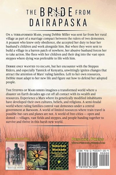 On a terraformed Mars, young Debbie Miller was sent far from her rural village as part of a marriage compact between the rulers of two demesnes. A peasant who knew only obedience, she accepted her duty to bear her husband's children and work alongside him. But when they were sent to build a village in a barren patch of nowhere, her abusive husband forces her to take action. She flees with her children and their dog into the vast open steppes where dying was preferable to life with him. Debbie only wanted to escape, but her encounter with the Steppes Riders, and especially Yannick of Kenyatta, unwittingly ignites changes that attract the attention of Mars' ruling families. Left to her own resources, Debbie must adapt to her new life and figure out how to defend her adopted people. The Steppes of Mars series imagines a transformed world where a disaster on Earth decades ago cut off all contact with its wealth and resources. Experience a Mars where its genetically modified inhabitants have developed their own cultures, beliefs, and religions. A semi-feudal world where ruling families control vast demesnes under a central government at Barsoom. A world of limited resources where train travel is possible but cars and planes are not. A world of free-cities - open and domed - villages, vast fields and steppes, and people banding together to survive and thrive in this harsh new world.
