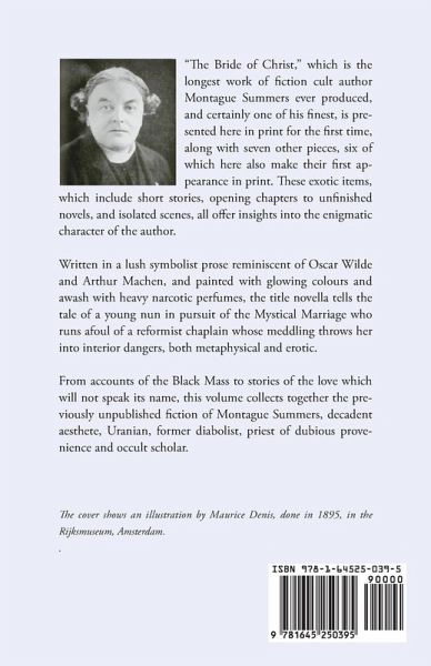 "The Bride of Christ," which is the longest work of fiction cult author Montague Summers ever produced, and certainly one of his finest, is presented here in print for the first time, along with seven other pieces, six of which here also make their first appearance in print. These exotic items, which include short stories, opening chapters to unfinished novels, and isolated scenes, all offer insights into the enigmatic character of the author. Written in a lush symbolist prose reminiscent of Oscar Wilde and Arthur Machen, and painted with glowing colours and awash with heavy narcotic perfumes, the title novella tells the tale of a young nun in pursuit of the Mystical Marriage who runs afoul of a reformist chaplain whose meddling throws her into interior dangers, both metaphysical and erotic. From accounts of the Black Mass to stories of the love which will not speak its name, this volume collects together the previously unpublished fiction of Montague Summers, decadent aesthete, Uranian, former diabolist, priest of dubious provenience and occult scholar.