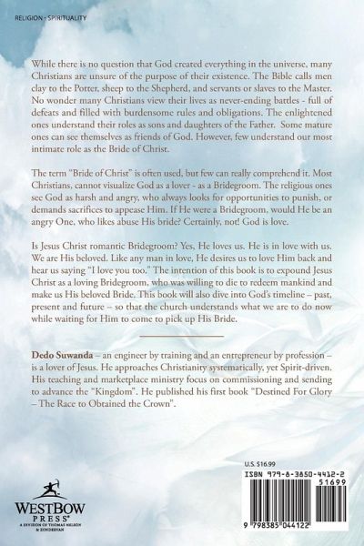 While there is no question that God created everything in the universe, many Christians are unsure of the purpose of their existence. The Bible calls men clay to the Potter, sheep to the Shepherd, and servants or slaves to the Master. No wonder many Christians view their lives as never-ending battles - full of defeats and filled with burdensome rules and obligations. The enlightened ones understand their roles as sons and daughters of the Father. Some mature ones can see themselves as friends of God. However, few understand our most intimate role as the Bride of Christ. The term "Bride of Christ" is often used, but few can really comprehend it. Most Christians, cannot visualize God as a lover - as a Bridegroom. The religious ones see God as harsh and angry, who always looks for opportunities to punish, or demands sacrifices to appease Him. If He were a Bridegroom, would He be an angry One, who likes abuse His bride? Certainly, not! God is love. Is Jesus Christ romantic Bridegroom? Yes, He loves us. He is in love with us. We are His beloved. Like any man in love, He desires us to love Him back and hear us saying "I love you too." The intention of this book is to expound Jesus Christ as a loving Bridegroom, who was willing to die to redeem mankind and make us His beloved Bride. This book will also dive into God's timeline - past, present and future - so that the church understands what we are to do now while waiting for Him to come to pick up His Bride.