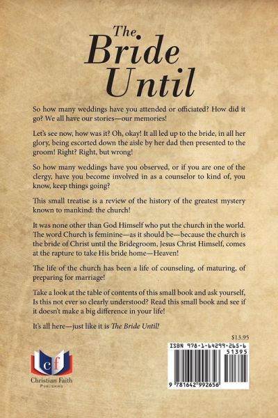 So how many weddings have you attended or officiated? How did it go? We all have our stories-our memories! Let's see now, how was it? Oh, okay! It all led up to the bride, in all her glory, being escorted down the aisle by her dad then presented to the groom! Right? Right, but wrong! So how many weddings have you observed, or if you are one of the clergy, have you become involved in as a counselor to kind of, you know, keep things going? This small treatise is a review of the history of the greatest mystery known to mankind: the church! It was none other than God Himself who put the church in the world. The word Church is feminine-as it should be-because the church is the bride of Christ until the Bridegroom, Jesus Christ Himself, comes at the rapture to take His bride home-Heaven! The life of the church has been a life of counseling, of maturing, of preparing for marriage! Take a look at the table of contents of this small book and ask yourself, Is this not ever so clearly understood? Read this small book and see if it doesn't make a big difference in your life! It's all here-just like it is The Bride Until!