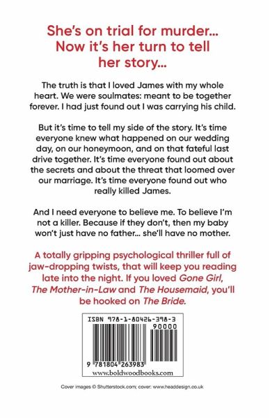 She's on trial for murder... Now it's her turn to tell her story... The truth is that I loved James with my whole heart. We were soulmates: meant to be together forever. On the morning of our wedding, I had just found out I was carrying his child. But it's time to tell my side of the story. It's time everyone knew what happened on that wedding day, on our honeymoon, and on that fateful last drive together. It's time everyone found out about the secrets and about the threat that loomed over our marriage. It's time everyone found out who really killed James. And I need everyone to believe me. To believe I'm not a killer. Because if they don't, then my baby won't just have no father... she'll have no mother. A totally gripping psychological thriller full of jaw-dropping twists, that will keep you reading late into the night. If you loved Gone Girl, The Mother-in-Law and The Housemaid, you'll be hooked on The Bride.
