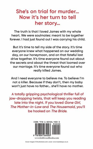 She's on trial for murder... Now it's her turn to tell her story... The truth is that I loved James with my whole heart. We were soulmates: meant to be together forever. On the morning of our wedding, I had just found out I was carrying his child. But it's time to tell my side of the story. It's time everyone knew what happened on that wedding day, on our honeymoon, and on that fateful last drive together. It's time everyone found out about the secrets and about the threat that loomed over our marriage. It's time everyone found out who really killed James. And I need everyone to believe me. To believe I'm not a killer. Because if they don't, then my baby won't just have no father... she'll have no mother. A totally gripping psychological thriller full of jaw-dropping twists, that will keep you reading late into the night. If you loved Gone Girl, The Mother-in-Law and The Housemaid, you'll be hooked on The Bride.