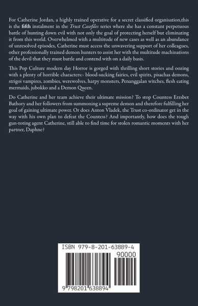 For Catherine Jordan, a highly trained operative for a secret classified organisation,this is the fifth instalment in the Trust Casefiles series where she has a constant perpetuous battle of hunting down evil with not only the goal of protecting herself but eliminating it from this world. Overwhelmed with a multitude of new cases as well as an abundance of unresolved episodes, Catherine must access the unwavering support of her colleagues, other professionally trained demon hunters to assist her with the multitude machinations of the devil that they must battle and contend with on a daily basis. This Pop Culture modern day Horror is gorged with thrilling short stories and oozing with a plenty of horrible characters:- blood-sucking fairies, evil spirits, pisachas demons, strigoi vampires, zombies, werewolves, harpy monsters, Penanggalan witches, flesh eating mermaids, jubokko and a Demon Queen. Do Catherine and her team achieve their ultimate mission? To stop Countess Erzsbet Bathory and her followers from summoning a supreme demon and therefore fulfilling her goal of gaining ultimate power. Or does Anton Vladek, the Trust co-ordinator get in the way with his own plan to defeat the Countess? And importantly, how does the tough gun-toting agent Catherine, still able to find time for stolen romantic moments with her partner, Daphne?