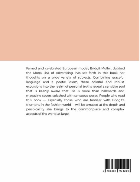 Famed and celebrated European model, Bridgit Muller, dubbed the Mona Lisa of Advertising, has set forth in this book her thoughts on a wide variety of subjects. Combining graceful language and a poetic idiom, these colorful and robust excursions into the realm of personal truths reveal a sensitive soul that is keenly aware that life is more than billboards and magazine covers splashed with sensuous poses. People who read this book - especially those who are familiar with Bridgit's triumphs in the fashion world - will be amazed at the depth and perspicacity she brings to the commonplace and complex aspects of the world at large.