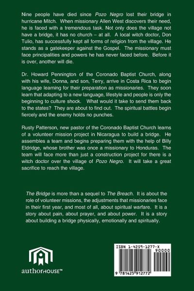 Nine people have died since Pozo Negro lost their bridge in hurricane Mitch. When missionary Allen West discovers their need, he is faced with a tremendous task. Not only does the village not have a bridge, it has no church - at all. A local witch doctor, Don Tulio, has successfully kept all forms of religion from the village. He stands as a gatekeeper against the Gospel. The missionary must face principalities and powers he has never faced before. Before it is over, another will die. Dr. Howard Pennington of the Coronado Baptist Church, along with his wife, Donna, and son, Terry, arrive in Costa Rica to begin language learning for their preparation as missionaries. They soon learn that adapting to a new language, lifestyle and people is only the beginning to culture shock. What would it take to send them back to the states? They are about to find out. The spiritual battles begin fiercely and the enemy holds no punches. Rusty Patterson, new pastor of the Coronado Baptist Church learns of a volunteer mission project in Nicaragua to build a bridge. He assembles a team and begins preparing them with the help of Billy Eldridge, whose brother was once a missionary to Honduras. The team will face more than just a construction project for there is a witch doctor over the village of Pozo Negro. It will take a great sacrifice to reach the village. The Bridge is more than a sequel to The Breach. It is about the role of volunteer missions, the adjustments that missionaries face in their first year, and most of all, about spiritual warfare. It is a story about pain, about prayer, and about power. It is a story about building a bridge physically, emotionally and spiritually.