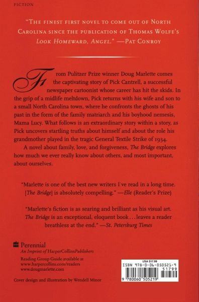 From Pulitzer Prize winner Doug Marlette comes the captivating story of Pick Cantrell, a successful newspaper cartoonist whose career has hit the skids. In the grip of a midlife meltdown, Pick returns with his wife and son to a small North Carolina town, where he confronts the ghosts of his past in the form of the family matriarch and his boyhood nemesis, Mama Lucy. What follows is an extraordinary story within a story, as Pick uncovers startling truths about himself and about the role his grandmother played in the tragic General Textile Strike Of 1934 A novel about family, love, and forgiveness, The Bridge explores how much we ever really know about others, and most important, about ourselves.