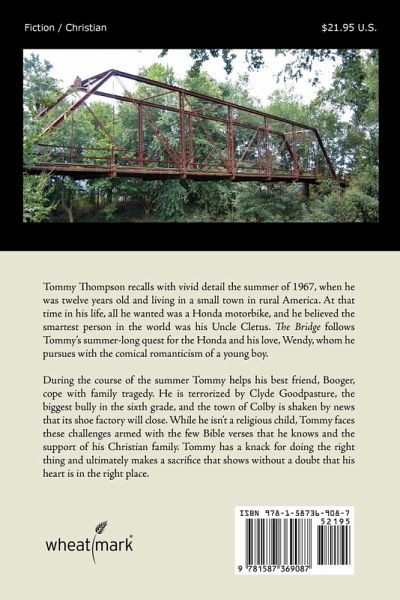 Tommy Thompson recalls with vivid detail the summer of 1967, when he was twelve years old and living in a small town in rural America. At that time in his life, all he wanted was a Honda motorbike, and he believed the smartest person in the world was his Uncle Cletus. The Bridge follows Tommy's summer-long quest for the Honda and his love, Wendy, whom he pursues with the comical romanticism of a young boy. During the course of the summer Tommy helps his best friend, Booger, cope with family tragedy. He is terrorized by Clyde Goodpasture, the biggest bully in the sixth grade, and the town of Colby is shaken by news that its shoe factory will close. While he isn't a religious child, Tommy faces these challenges armed with the few Bible verses that he knows and the support of his Christian family. Tommy has a knack for doing the right thing and ultimately makes a sacrifice that shows without a doubt that his heart is in the right place.