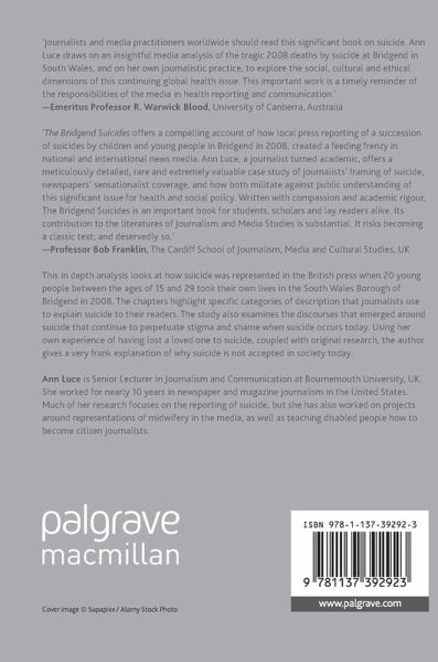 This in depth analysis looks at how suicide was represented in the British press when 20 young people between the ages of 15 and 29 took their own lives in the South Wales Borough of Bridgend in 2008. The chapters highlight specific categories of description that journalists use to explain suicide to their readers. The study also examines the discourses that emerged around suicide that continue to perpetuate stigma and shame when suicide occurs today. Using her own experience of having lost a loved one to suicide, coupled with original research, the author gives a very frank explanation of why suicide is not accepted in society today.