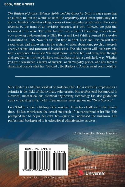 "The Bridges of Avalon: Science, Spirit, and the Quest for Unity" is more than just another attempt to join the worlds of scientific objectivity and human spirituality. It is also a chronicle of truth-seeking; a story of two everyday people whose lives were touched by the hand of an invisible presence, and who followed the path that beckoned in its wake. Two paths became one; a path of friendship, research, and ever growing understanding as Nick Reiter and Lori Schillig formed The Avalon Foundation in 1996. Now for the first time in print, Nick and Lori present their experiences and discoveries in the realms of alien abductions, psychic research, energy healing, and paranormal investigation. The tales herein will touch any who have experienced first-hand "the mysterious" in their life, and bring fresh thought and speculation to those who have studied these topics in a scholarly way. Whether you are a researcher, spiritual seeker, student, or just another wonderfully everyday person who has dared to dream and ponder that which lies "beyond", the bridges of Avalon await your footsteps!