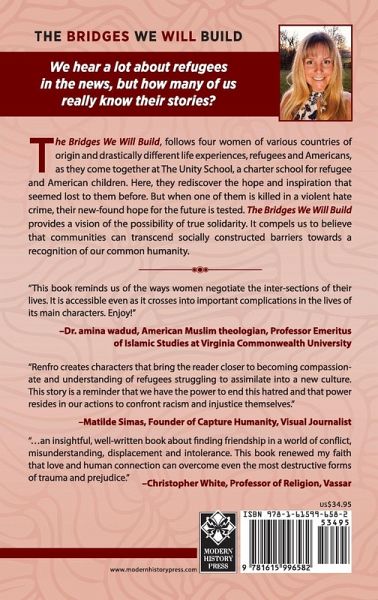 We hear a lot about refugees in the news, but how many of us really know their stories?The Bridges We Will Build, follows four women of various countries of origin and drastically different life experiences, refugees and Americans, as they come together at The Unity School, a charter school for refugee and American children. Here, they rediscover the hope and inspiration that seemed lost to them before. But when one of them is killed in a violent hate crime, their new-found hope for the future is tested. The Bridges We Will Build provides a vision of the possibility of true solidarity. It compels us to believe that communities can transcend socially constructed barriers towards a recognition of our common humanity. "The Bridges We Will Build reminds us of the ways women negotiate the inter-sections of their lives. It is accessible even as it crosses into important complications in the lives of its main characters. Enjoy!" --Dr. amina wadud, American Muslim theologian, Professor Emeritus of Islamic Studies at Virginia Commonwealth University "Renfro creates characters that bring the reader closer to becoming compassionate and understanding of refugees struggling to assimilate into a new culture. This story is a reminder that we have the power to end this hatred and that power resides in our actions to confront racism and injustice themselves." --Matilde Simas, Founder of Capture Humanity, Visual Journalist "The Bridges We Will Build is an insightful, well-written book about finding friendship in a world of conflict, misunderstanding, displacement and intolerance. This book renewed my faith that love and human connection can overcome even the most destructive forms of trauma and prejudice." --Christopher White, Professor of Religion, Vassar From Modern History Press www.ModernHistoryPress.com