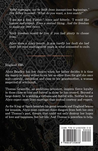 Death and life are in the power of the tongue. England 1586 Alyce Bradley has few choices when her father decides it is time she marry as many refuse to see her as other than the girl she once was-unruly, outspoken and close to her grandmother, a woman suspected of witchcraft. Thomas Granville, an ambitious privateer, inspires fierce loyalty in those close to him and hatred in those he has crossed. Beyond a large dowry, he is seeking a virtuous and dutiful wife. Neither Thomas not Alyce expect more from marriage than mutual courtesy and respect. As the King of Spain launches his great armada and England braces for invasion, Alyce must confront closer dangers from both her own and Thomas's past, threats that could not only destroy her hopes of love and happiness but her life. And Thomas is powerless to help. 'People never forget. When the fancy takes them, they bring the old stories out and embroider them further.'