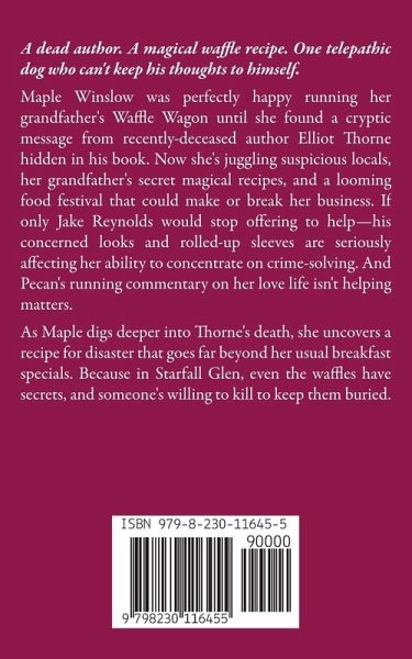 A dead author. A magical waffle recipe. One telepathic dog who can't keep his thoughts to himself. Maple Winslow was perfectly happy running her grandfather's Waffle Wagon until she found a cryptic message from recently-deceased author Elliot Thorne hidden in his book. Now she's juggling suspicious locals, her grandfather's secret magical recipes, and a looming food festival that could make or break her business. If only Jake Reynolds would stop offering to help-his concerned looks and rolled-up sleeves are seriously affecting her ability to concentrate on crime-solving. And Pecan's running commentary on her love life isn't helping matters. As Maple digs deeper into Thorne's death, she uncovers a recipe for disaster that goes far beyond her usual breakfast specials. Because in Starfall Glen, even the waffles have secrets, and someone's willing to kill to keep them buried.