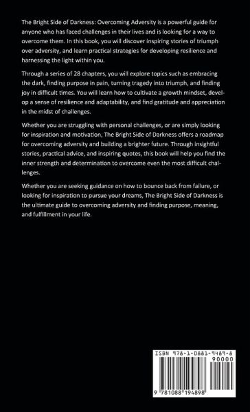 The Bright Side of Darkness: Overcoming Adversity is a powerful guide for anyone who has faced challenges in their lives and is looking for a way to overcome them. In this book, you will discover inspiring stories of triumph over adversity, and learn practical strategies for developing resilience and harnessing the light within you. Through a series of 28 chapters, you will explore topics such as embracing the dark, finding purpose in pain, turning tragedy into triumph, and finding joy in difficult times. You will learn how to cultivate a growth mindset, develop a sense of resilience and adaptability, and find gratitude and appreciation in the midst of challenges. Whether you are struggling with personal challenges, or are simply looking for inspiration and motivation, The Bright Side of Darkness offers a roadmap for overcoming adversity and building a brighter future. Through insightful stories, practical advice, and inspiring quotes, this book will help you find the inner strength and determination to overcome even the most difficult challenges. Whether you are seeking guidance on how to bounce back from failure, or looking for inspiration to pursue your dreams, The Bright Side of Darkness is the ultimate guide to overcoming adversity and finding purpose, meaning, and fulfillment in your life.