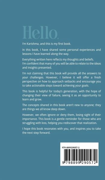 The Bright Side of Failure is a book that helps you see your failures in a new light, turning them into motivation to keep pushing toward your goals. Failure is a part of life; especially when you are stepping out of your comfort zone and learning new things. But in today's hyper-competitive world, many struggle to handle the loss. We need to change how we see failure. It's not the end of the world, and it certainly doesn't define our worth. Our lives are far more valuable than any temporary fall. Instead of fearing failure, we should see it as an opportunity for growth and self-improvement. With the right mindset, you can carve something beautiful out of even the hardest struggles. But this isn't an overnight process; it takes years of effort, resilience, and self-belief. What truly matters is the ability to find wisdom in every setback and keep pushing forward. This book helps you understand and accept self-doubt and fear, turning them into a positive force to stay motivated during tough times. When you fail, take a step back, not to give up, but for a comeback. Give yourself time to learn, and find a better path forward. That's exactly what this book is here to help you do. It offers a ray of hope when things don't go as planned, reminding you that failure isn't a reason to quit; it's a reason to grow. I hope this book inspires you to see failure in a new light and never give up on your dreams.