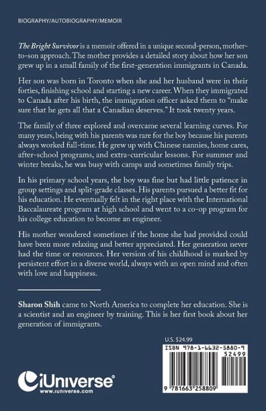 The Bright Survivor is a memoir offered in a unique second-person, mother-to-son approach. The mother provides a detailed story about how her son grew up in a small family of the first-generation immigrants in Canada. Her son was born in Toronto when she and her husband were in their forties, finishing school and starting a new career. When they immigrated to Canada after his birth, the immigration officer asked them to "make sure that he gets all that a Canadian deserves." It took twenty years. The family of three explored and overcame several learning curves. For many years, being with his parents was rare for the boy because his parents always worked full-time. He grew up with Chinese nannies, home cares, after-school programs, and extra-curricular lessons. For summer and winter breaks, he was busy with camps and sometimes family trips. In his primary school years, the boy was fine but had little patience in group settings and split-grade classes. His parents pursued a better fit for his education. He eventually felt in the right place with the International Baccalaureate program at high school and went to a co-op program for his college education to become an engineer. His mother wondered sometimes if the home she had provided could have been more relaxing and better appreciated. Her generation never had the time or resources. Her version of his childhood is marked by persistent effort in a diverse world, always with an open mind and often with love and happiness.