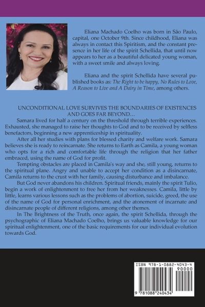 UNCONDITIONAL LOVE SURVIVES THE BOUNDARIES OF EXISTENCES AND GOES FAR BEYOND... Samara lived for half a century on the threshold through terrible experiences. Exhausted, she managed to raise her thoughts to God and to be received by selfless benefactors, beginning a new apprenticeship in spirituality. After all her studies with plans for blessed charity and welfare work. Samara believes she is ready to reincarnate. She returns to Earth as Camila, a young woman who opts for a rich and comfortable life through the religion that her father embraced, using the name of God for profit. Tempting obstacles are placed in Camila's way and she, still young, returns to the spiritual plane. Angry and unable to accept her condition as a disincarnate, Camila returns to the crust with her family, causing disturbance and imbalance. But God never abandons his children. Spiritual friends, mainly the spirit Tulio, begin a work of enlightenment to free her from her weaknesses. Camila, little by little, learns various lessons such as the problems of abortion, suicide, greed, the use of the name of God for personal enrichment, and the atonement of incarnate and disincarnate people of different religions, among other themes. In The Brightness of the Truth, once again, the spirit Schellida, through the psychographic of Eliana Machado Coelho, brings us valuable knowledge for our spiritual enlightenment, one of the basic requirements for our individual evolution towards God.
