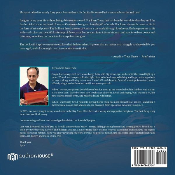 Ryan W. Tracy hadn¿t said a word in almost forty years when his family discovered he¿s a remarkable artist and poet. He had been diagnosed with autism at age seven and lived in a world of his own until the day he picked up a paint brush, which gave him the gift of words. Those words came out in a flood of art and poetry that celebrate landscapes, flowers, ribbons of color, valleys of hope, and the power of love. His poems are just as remarkable as his artwork. In ¿The Wild Me,¿ he celebrates his spirit, writing: The wildness of my soul finds its grace in the most creative ventures The singular blowing tree bends but never breaks Autism seeks to break my wild spirit from within I stand strong in hurricane force trials that place storms at my branches I refuse the call to quit Infused with wonder, talent, and beauty, yoüll be inspired to keep reaching for the heavens no matter what obstacles stand in the way with The Brilliant Brush-Strokes of Autism.
