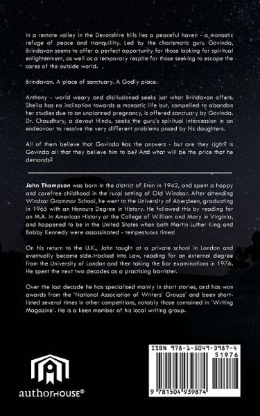 In a remote valley in the Devonshire hills lies a peaceful haven - a monastic refuge of peace and tranquillity. Led by the charismatic guru Govinda, Brindavan seems to offer a perfect opportunity for those looking for spiritual enlightenment, as well as a temporary respite for those seeking to escape the cares of the outside world. Brindavan. A place of sanctuary. A Godly place. Anthony - world weary and disillusioned seeks just what Brindavan offers. Sheila has no inclination towards a monastic life but, compelled to abandon her studies due to an unplanned pregnancy, is offered sanctuary by Govinda. Dr. Chaudhury, a devout Hindu, seeks the guru's spiritual intercession in an endeavour to resolve the very different problems posed by his daughters. All of them believe that Govinda has the answers - but are they right? Is Govinda all that they believe him to be? And what will be the price that he demands?