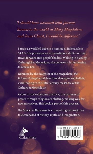 From the award-winning writer and director of The Women's Jail Project and author of Dancing the Labyrinth, comes an evocative tale that unashamedly merges renowned historical characters and events into a spellbinding story of destiny. "I should have assumed with parents known to the world as Mary Magdalene and Jesus Christ, I would be different." It is not her lineage that makes Sara different. It is her ability to time travel forward into other people's bodies. When Sara, whose Aramaic name means 'bringer of happiness,' wakes up in Sarah-Marie, a young Cathar from Montségur, she believes it is her destiny to rescue her from the 13th Century siege. By saving Sarah-Marie, Sara hopes to safeguard her mother's gospel. In this odyssey of death, destiny, and soul's purpose, we join Sara as she heeds her call, journeying from Jerusalem to Egypt to Crete until arriving in France. Narrated by the daughter of Mary Magdalene, the Bringer of Happiness delves into ideologies and heresies, culminating in the 13th Century massacre of the Cathars at Montségur. As our histories become unstuck, the patterns of power through religion are shifting, making way for new narratives. This book is part of this process. The Bringer of Happiness is a compelling (almost) true tale comprised of history, myth, and imagination.