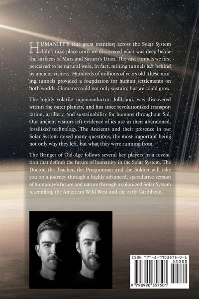 Humanity's true great manifest across the Solar System didn't take place until we discovered what was deep below the surfaces of Mars and Saturn's Titan. The vast tunnels we first perceived to be natural were, in fact, mining tunnels left behind by ancient visitors. Hundreds of millions of years old, these mining tunnels provided a foundation for human settlements on both worlds. Humans could not only sustain, but we could grow. The highly volatile superconductor, Jollitium, was discovered within the outer planets, and has since revolutionized transportation, artillery, and sustainability for humans throughout Sol. Our ancient visitors left evidence of its use in their abandoned, fossilized technology. The Ancients and their presence in our Solar System raised many questions, the most important being not only why they left, but what they were running from. The Bringer of Old Age follows several key players in a revolution that defines the future of humanity in the Solar System. The Doctor, the Teacher, the Programmer and the Soldier will take you on a journey through a highly advanced, speculative version of humanity's future and nature through a colonized Solar System resembling the American Wild West and the early Caribbean.