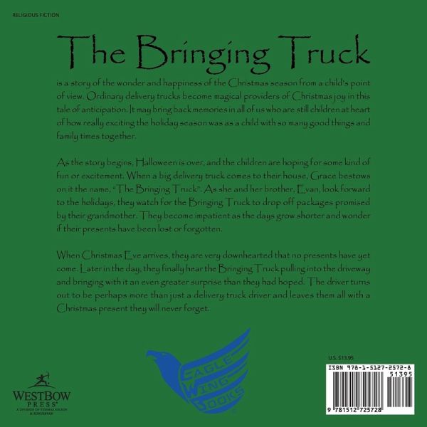 The Bringing Truck is a story of the wonder and happiness of the Christmas season from a child's point of view. Ordinary delivery trucks become magical providers of Christmas joy in this tale of anticipation. It may bring back memories in all of us who are still children at heart of how really exciting the holiday season was as a child with so many good things and family times together. As the story begins, Halloween is over, and the children are hoping for some kind of fun or excitement. When a big delivery truck comes to their house, Grace bestows on it the name, "The Bringing Truck". As she and her brother, Evan, look forward to the holidays, they watch for the Bringing Truck to drop off packages promised by their grandmother. They become impatient as the days grow shorter and wonder if their presents have been lost or forgotten. When Christmas Eve arrives, they are very downhearted that no presents have yet come. Later in the day, they finally hear the Bringing Truck pulling into the driveway and bringing with it an even greater surprise than they had hoped. The driver turns out to be perhaps more than just a delivery truck driver and leaves them all with a Christmas present they will never forget.