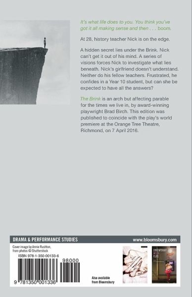 It's what life does to you. We don't have time to waste. Worrying over the small stuff while the big stuff takes its toll. You're living and then . . . boom. At 27, History teacher Nick is on the edge. A hidden secret lies under the Brink. Nick can't get it out of his mind. A series of visions force Nick to investigate what lies beneath. Nick's girlfriend doesn't understand. Neither do his fellow teachers. Frustrated, he confides in a Year 10 student but can she be expected to have all the answers? The Brink is an arch but affecting parable for the times we live in. This edition was published to coincide with the play's world premiere at the Orange Tree Theatre, London, in April 2016.