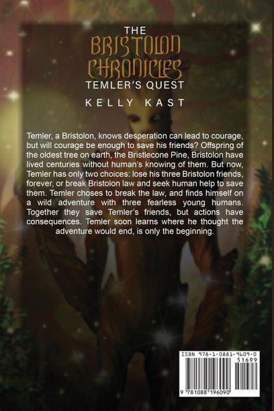 Temler, a Bristolon, knows desperation can lead to courage, but will courage be enough to save his friends? Offspring of the oldest tree on earth, the Bristlecone Pine, Bristolon have lived centuries without human's knowing of them. But now, Temler has only two choices: lose his three Bristolon friends, forever, or break Bristolon law and seek human help to save them. Temler choses to break the law, and finds himself on a wild adventure with three fearless young humans. Together they save Temler's friends, but actions have consequences. Temler soon learns where he thought the adventure would end, is only the beginning.