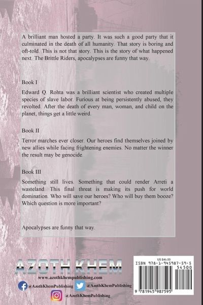 A brilliant man hosted a party. It was such a good party that it culminated in the death of all humanity. That story is boring and oft-told. This is not that story. This is the story of what happened next. The Brittle Riders, apocalypses are funny that way. Book I Edward Q. Rohta was a brilliant scientist who created multiple species of slave labor. Furious at being persistently abused, they revolted. After the death of every man, woman, and child on the planet, things get a little weird. Book II Terror marches ever closer. Our heroes find themselves joined by new allies while facing frightening enemies. No matter the winner the result may be genocide. Book III Something still lives. Something that could render Arreti a wasteland. This final threat is making its push for world domination. Who will save our heroes? Who will buy them booze? Which question is more important? Apocalypses are funny that way