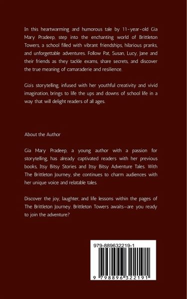 Welcome to The Brittleton Journey! In this heartwarming and humorous tale by 11-year-old Gia Mary Pradeep, step into the enchanting world of Brittleton Towers, a school filled with vibrant friendships, hilarious pranks, and unforgettable adventures. Follow Pat, Susan, Lucy, Jane and their friends as they tackle exams, share secrets, and discover the true meaning of camaraderie and resilience. Gia's storytelling, infused with her youthful creativity and vivid imagination, brings to life the ups and downs of school life in a way that will delight readers of all ages.