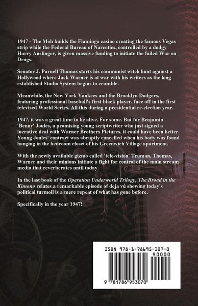 1947 - The Mob establishes the Flamingo casino creating the famous Vegas strip. The Federal Bureau of Narcotics, controlled by a dodgy Harry Anslinger, is given massive funding to initiate the failed War on Drugs. Senators Thomas and Rankin start their communist witch hunt against a Hollywood where Jack Warner is at war with his writers as the long established Studio System begins to crumble. All this while the New York Yankees and the Brooklyn Dodgers, featuring professional baseball's first black player, face off in the first televised World Series. And oh yeah, it’s a Presidential re-election year. 1947 - It was a great time to be alive. For some. But for Benjamin 'Benny' Joules' a promising young script writer who just signed a lucrative contract with Warner Brothers it could be better. Young Joules’ contract was abruptly cancelled when his body was found hanging in the closet of his Greenwich Village apartment. With the newly available gizmo called ‘tele-vision’ Truman, Thomas, Rankin, Warner and others initiate a fight for control of the main stream media that reverberates until today. In the last book of the Operation Underworld Trilogy, The Broad in the Kimono, a remarkable episode of déjà vu is captured showing today’s political turmoil is a mere repeat of what has gone before. Specifically in the year 1947.