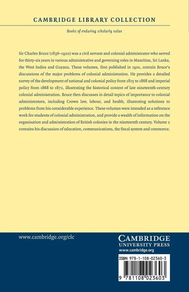 Sir Charles Bruce (1836-1920) was a civil servant and colonial administrator who served for thirty-six years in various administrative and governing roles in Mauritius, Sri Lanka, the West Indies and Guyana. These volumes, first published in 1910, contain Bruce's discussions of the major problems of colonial administration. He provides a detailed survey of the development of national and colonial policy from 1815 to 1868 and imperial policy from 1868 to 1872, illustrating the historical context of late nineteenth-century colonial administration. Bruce then discusses in detail topics of importance to colonial administrators, including Crown law, labour and health, illustrating solutions to problems from his considerable experience. These volumes were intended as a reference work for students of colonial administration, and provide a wealth of information on the organisation and administration of British colonies in the nineteenth century. Volume 2 contains his discussion of education, communications, the fiscal system and commerce.