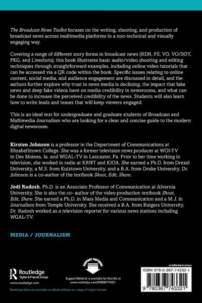 Covering a range of different story forms in broadcast news (RDR, FS, VO, VO/SOT, PKG, and Liveshots), this book illustrates basic audio/video shooting and editing techniques through straightforward examples, including online video tutorials that can be accessed via a QR code within the book. Specific issues relating to online content, social media, and audience engagement are discussed in detail, and the authors further explore why trust in news media is declining, the impact that fake news and deep fake videos have on media credibility in newsrooms, and what can be done to increase the perceived credibility of the news. Students will also learn how to write leads and teases that will keep viewers engaged.