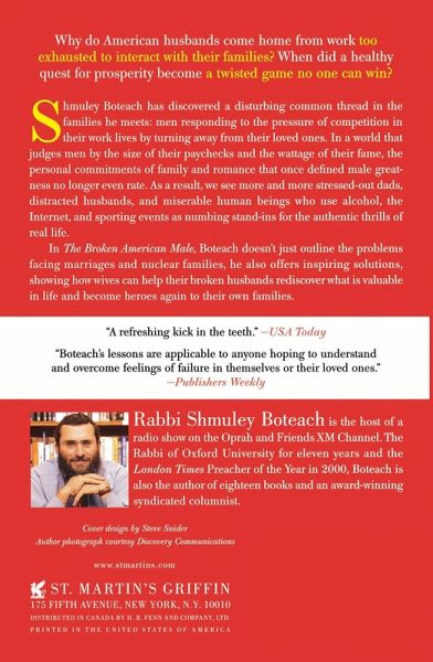 Why do American husbands come home from work too exhausted to interact with their families? When did a healthy quest for prosperity become a twisted game no one can win? Shmuley Boteach has discovered a disturbing common thread in the families he meets: men responding to the pressure of competition in their work lives by turning away from their loved ones. In a world that judges men by the size of their paychecks and the wattage of their fame, the personal commitments of family and romance which once defined male greatness no longer even rate. As a result, we see more and more stressed-out dads, distracted husbands and miserable human beings who use alcohol, the internet, and sporting events as numbing stand-ins for the authentic thrills of real life. In THE BROKEN AMERICAN MALE, Boteach doesn't just outline the problems facing marriages and nuclear families. He also offers inspiring solutions, showing how wives can help their broken husbands rediscover what is valuable in life, and become heroes again to their own families.