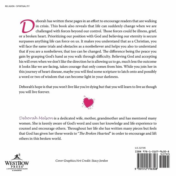 Deborah has written these pages in an effort to encourage readers that are walking in crisis. This book also reveals that life can suddenly change when we are challenged with forces beyond our control. Those forces could be illness, grief, or a broken heart. Prioritizing our position with God and believing our eternity is secure surpasses anything life can force on us. It makes you understand that as a Christian, you will face the same trials and obstacles as a nonbeliever and helps you also to understand that if you are a nonbeliever, that too can be changed. The difference being the peace you gain by grasping God’s hand as you walk through difficulty. Believing God and accepting his will even when we don’t like the direction he is allowing us to go, much less the outcome it looks like we are facing, takes courage that only comes from him. While you join her in this journey of heart disease, maybe you will find some scripture to latch onto and possibly a word or two of wisdom that can become light in your darkness. Deborah’s hope is that you won’t live like you’re dying but that you will learn to live as though you will live forever.