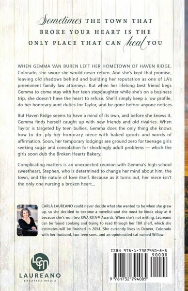 "When Gemma left her hometown of Haven Ridge, Colorado, she swore she'd never return. And she's kept that promise, leaving old shadows behind and building her reputation as one of LA's preeminent family law attorneys. But when her lifelong best friend begs Gemma to come stay with her teen stepdaughter while she's on a business trip, she doesn't have the heart to refuse. She'll simply keep a low profile, do her honorary aunt duties for Taylor, and be gone before anyone notices. But Haven Ridge seems to have a mind of its own, and before she knows it, Gemma finds herself caught up with new friends and old rivalries. When Taylor is targeted by teen bullies, Gemma does the only thing she knows how to do: ply her honorary niece with baked goods and words of affirmation. Soon her temporary lodgings are ground zero for teenage girls seeking sugar and consolation for shockingly adult problems--which the girls soon dub the Broken Hearts Bakery. Complicating matters is an unexpected reunion with Gemma's high school sweetheart, Stephen, who is determined to change her mind about him, the town, and the nature of love itself. Because as it turns out, her niece isn't the only one nursing a broken heart."--Provided by publisher.