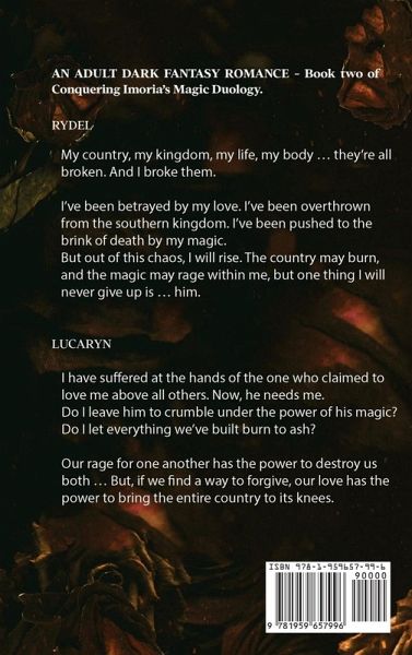 AN ADULT DARK FANTASY ROMANCE - Book two of Conquering Imoria's Magic Duology. RYDEL My country, my kingdom, my life, my body ... they're all broken. And I broke them. I've been betrayed by my love. I've been overthrown from the southern kingdom. I've been pushed to the brink of death by my magic. But out of this chaos, I will rise. The country may burn, and the magic may rage within me, but one thing I will never give up is ... him. LUCARYN I have suffered at the hands of the one who claimed to love me above all others. Now, he needs me. Do I leave him to crumble under the power of his magic? Do I let everything we have built burn to ash? Our rage for one another has the power to destroy us both ... But, if we find a way to forgive, our love has the power to bring the entire country to its knees.