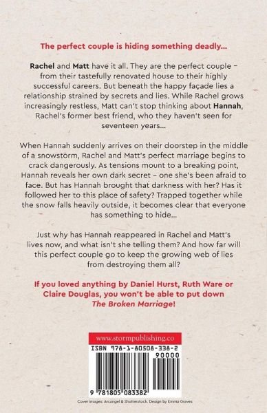 The perfect couple is hiding something deadly... Rachel and Matt have it all. They are the beautiful couple - from their tastefully renovated house to their highly successful careers. But beneath the happy façade lies a relationship strained by secrets and lies. While Rachel grows increasingly restless, Matt can't stop thinking about Hannah, Rachel's former best friend, who they haven't seen for seventeen years... When Hannah suddenly arrives on their doorstep in the middle of a snowstorm, Rachel and Matt's perfect marriage begins to crack dangerously. As tensions mount to a breaking point, Hannah reveals her own dark secret - one she's been afraid to face. But has Hannah brought that darkness with her? Has it followed her to this place of safety? Trapped together while the snow falls heavily outside, it becomes clear that everyone has something to hide... Just why has Hannah reappeared in Rachel and Matt's lives now, and what isn't she telling them? And how far will this perfect couple go to keep the growing web of lies from destroying them all? If you loved anything by Daniel Hurst, Ruth Ware or Clare Douglas, you won't be able to put down The Broken Marriage!