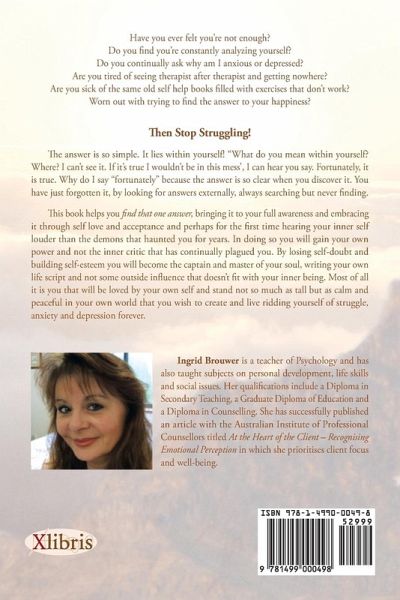 Have you ever felt you're not enough? Do you find you're constantly analyzing yourself? Do you continually ask why am I anxious or depressed? Are you tired of seeing therapist after therapist and getting nowhere? Are you sick of the same old self help books filled with exercises that don't work? Worn out with trying to find the answer to your happiness? Then Stop Struggling! The answer is so simple. It lies within yourself! "What do you mean within yourself? Where? I can't see it. If it's true I wouldn't be in this mess', I can hear you say. Fortunately, it is true. Why do I say "fortunately" because the answer is so clear when you discover it. You have just forgotten it, by looking for answers externally, always searching but never finding. This book helps you find that one answer, bringing it to your full awareness and embracing it through self love and acceptance and perhaps for the first time hearing your inner self louder than the demons that haunted you for years. In doing so you will gain your own power and not the inner critic that has continually plagued you. By losing self-doubt and building self-esteem you will become the captain and master of your soul, writing your own life script and not some outside influence that doesn't fit with your inner being. Most of all it is you that will be loved by your own self and stand not so much as tall but as calm and peaceful in your own world that you wish to create and live ridding yourself of struggle, anxiety and depression forever.