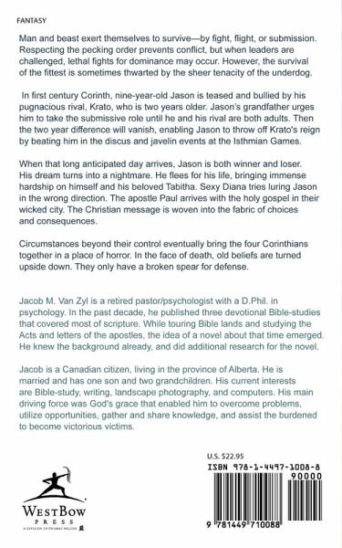 Man and beast exert themselves to survive-by fight, flight, or submission. Respecting the pecking order prevents conflict, but when leaders are challenged, lethal fights for dominance may occur. However, the survival of the fittest is sometimes thwarted by the sheer tenacity of the underdog. In first century Corinth, nine-year-old Jason is teased and bullied by his pugnacious rival, Krato, who is two years older. Jason's grandfather urges him to take the submissive role until he and his rival are both adults. Then the two year difference will vanish, enabling Jason to throw off Krato's reign by beating him in the discus and javelin events at the Isthmian Games. When that long anticipated day arrives, Jason is both winner and loser. His dream turns into a nightmare. He flees for his life, bringing immense hardship on himself and his beloved Tabitha. Sexy Diana tries luring Jason in the wrong direction. The apostle Paul arrives with the holy gospel in their wicked city. The Christian message is woven into the fabric of choices and consequences. Circumstances beyond their control eventually bring the four Corinthians together in a place of horror. In the face of death, old beliefs are turned upside down. They only have a broken spear for defense.