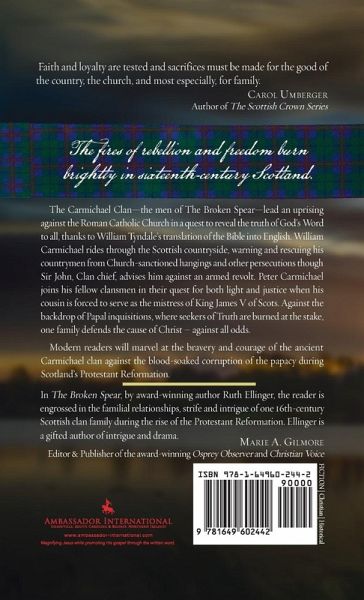 The fires of rebellion and freedom burn brightly in sixteenth-century Scotland. The Carmichael Clan-the men of The Broken Spear-lead an uprising against the Roman Catholic Church in a quest to reveal the truth of God's Word to all, thanks to William Tyndale's translation of the Bible into English. William Carmichael rides through the Scottish countryside, warning and rescuing his countrymen from Church-sanctioned hangings and other persecutions though Sir John, Clan chief, advises him against an armed revolt. Peter Carmichael joins his fellow clansmen in their quest for both light and justice when his cousin is forced to serve as the mistress of King James V of Scots. Against the backdrop of Papal inquisitions, where seekers of Truth are burned at the stake, one family defends the cause of Christ - against all odds. Modern readers will marvel at the bravery and courage of the ancient Carmichael clan against the blood-soaked corruption of the papacy during Scotland's Protestant Reformation.
