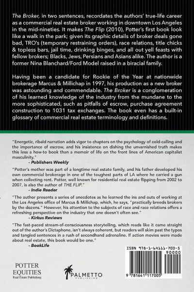 The Broker, in two sentences, recordates the authors' true-life career as a commercial real estate broker working in downtown Los Angeles in the mid-nineties. It makes The Flip (2010), Potter's first book look like a walk in the park; given its graphic details of broker deals gone bad, TRO's (temporary restraining orders), race relations, title chicks & topless bars, jail time, drinking binges, and all out yell feasts with fellow brokers; Blacks, Jews, Persians and Asians alike. The author is a former Nina Blanchard/Ford Model raised in a biracial family. Having been a candidate for Rookie of the Year at nationwide brokerage Marcus & Millichap in 1997, his production as a new broker was astounding and commendable. The Broker is a conglomeration of his learned knowledge of the industry from the mundane to the more sophisticated, such as pitfalls of escrow, purchase agreement construction to 1031 tax exchanges. The book even has a built-in glossary of commercial real estate terminology and definitions.